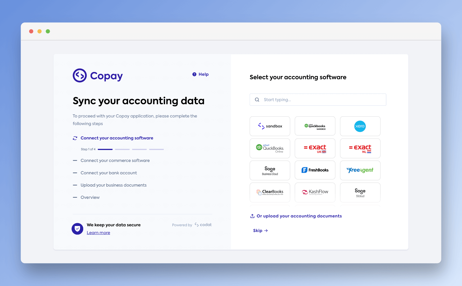 • Some users may be concerned sharing their data at a codat.io domain. Consider warning them about visiting a third-party website for the authorization process.