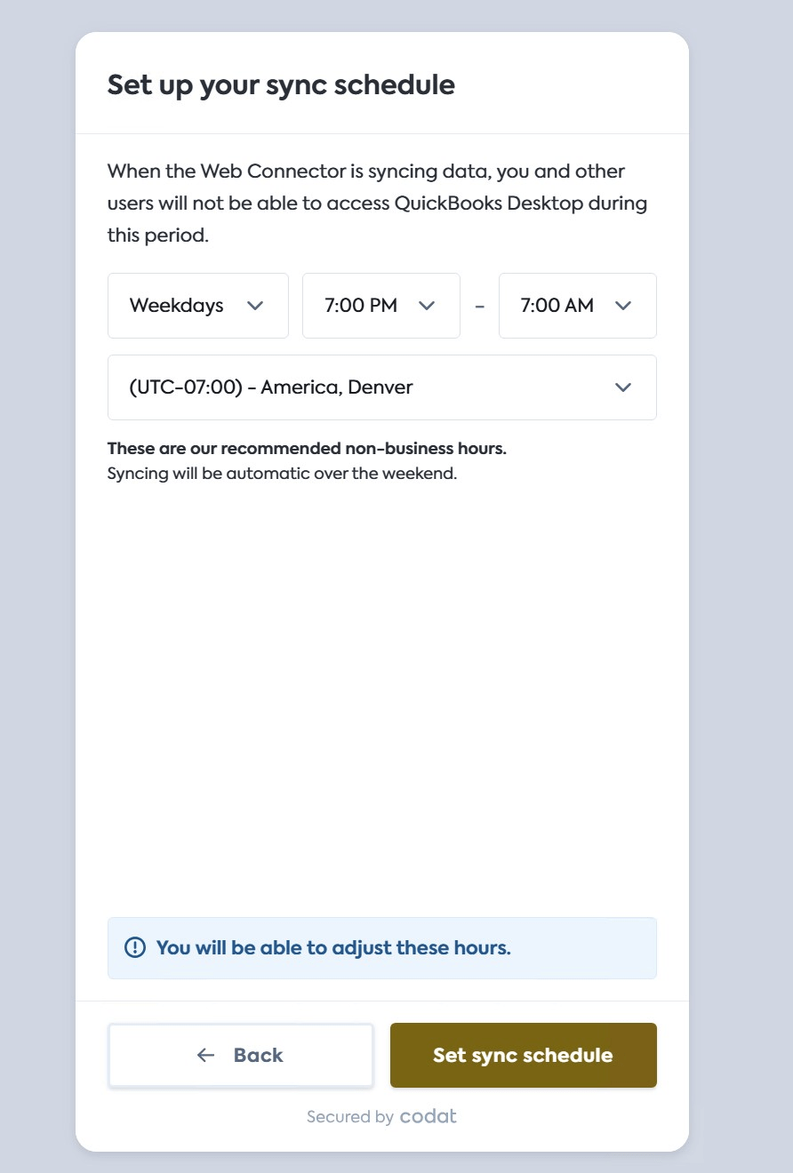 When issues occur in Codat’s QuickBooks Desktop integration, it's usually because the QuickBooks Desktop program is in use at the same time as the Intuit Web Connector is actively syncing data with Codat. This optional screen allows your end users to schedule syncsSync The process of fetching the latest data from a connected data source. Syncs can be triggered manually or run automatically on a schedule. to run outside of their business hours, avoiding the conflict.