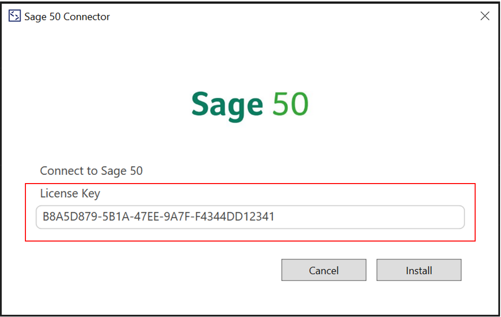 The user should have been provided with a License Key when they downloaded the Sage 50 Accounts Connector. They should enter this in the License Key box and then click Install.